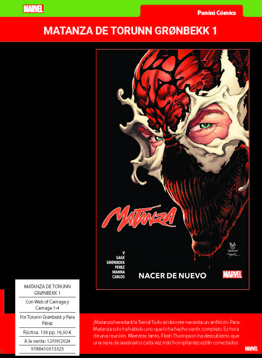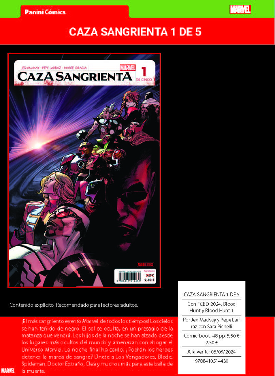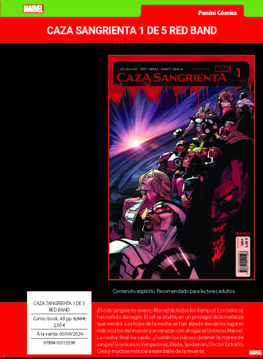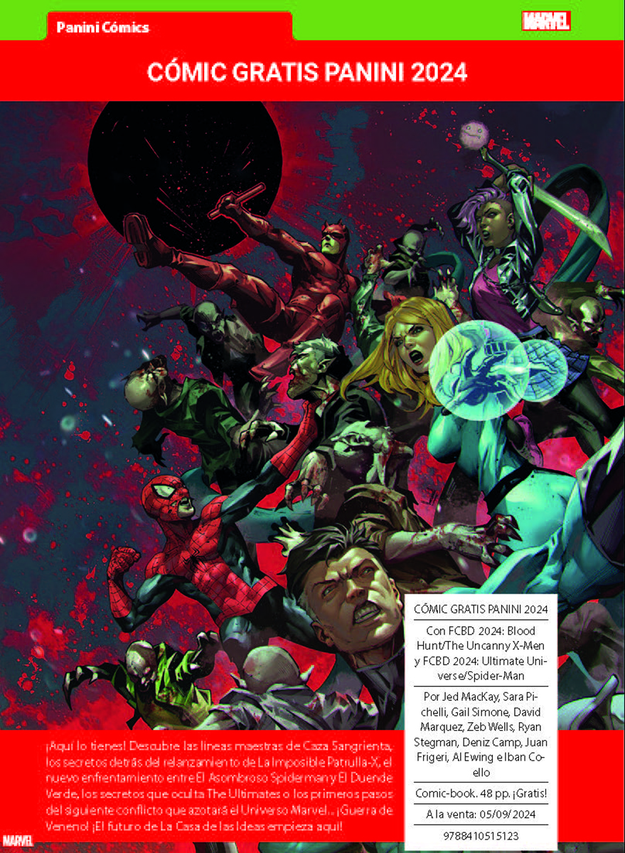 Como se indica en la nota de prensa, este mes destaca «la nueva entrega del CÓMIC GRATIS PANINI, en que encontrarás el prólogo de CAZA SANGRIENTA, el relanzamiento de LA IMPOSIBLE PATRULLA-X, el siguiente enfrentamiento de Spiderman y El Duende Verde, un avance de la nueva era de THE ULTIMATES o los primeros pasos hacia GUERRA DE VENENO,»