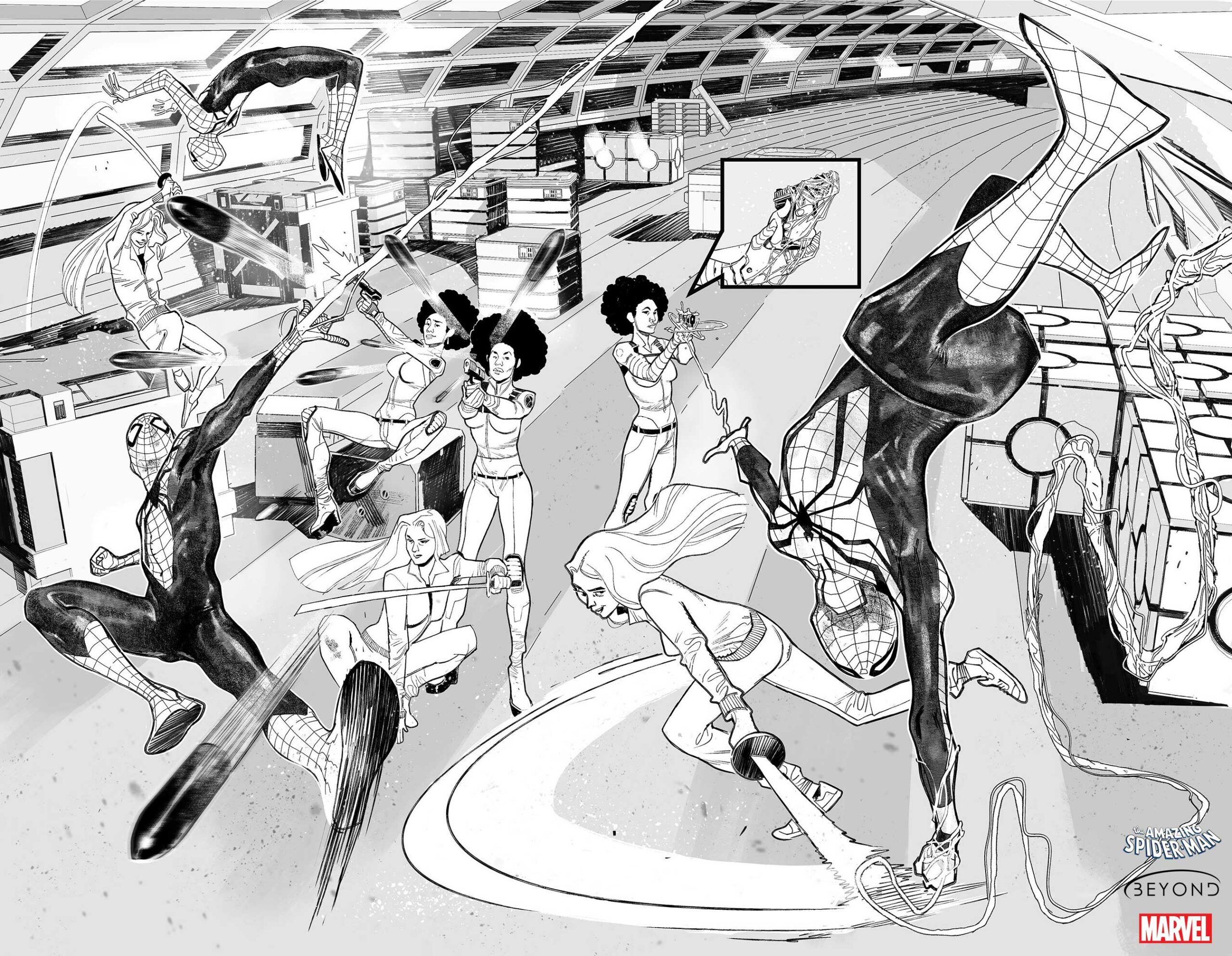 «Cuando empezamos a construir «Beyond», sabía que teníamos que quitar todos los frenos en la parte artística. Esto empezó asegurándonos que Patrick Gleason iba a estar con nosotros desde el comienzo tanto como guionista como dibujante. Sus recientes portadas para el trepamuros han emocionado y han añadido otro hito a su increíble carrera. Rápidamente se ha ubicado como la piedra maestra de nuestra vertiente artística, pero teníamos que asegurarnos que quien le acompañara fuera también un artista de élite», comenta el editor Nick Lowe en la nota de presentación. «Sara Pichelli es una leyenda absoluta, ha creado algunas de las obras que más impacto han tenido en la última década. Es una locura pensar que ésta será la primera vez que dibuje Amazing Spider-Man, y su magistral trabajo ya nos ha quitado la respiración. El trabajo de Michael Dowling en Unfollow y otras obras permitió que le contrataran para ilustra la serie de la Gata Negra, y en su trabajo ha demostrado que puede convertirse en un artista estelar, algo que ya nos está demostrando en los números que ha hecho. Y ser capaces de contar con Arthur Adams como artista para las portadas… Desde las clásicas de los anuales de La Patrulla-X hasta el día de hoy, Arthur ha definido el Universo Marvel visualmente casi mejor que ningún otro. Tenerlo con nosotros me hace estar más que emocionado. Y esperad a que revelemos al resto de nuestros artistas…»