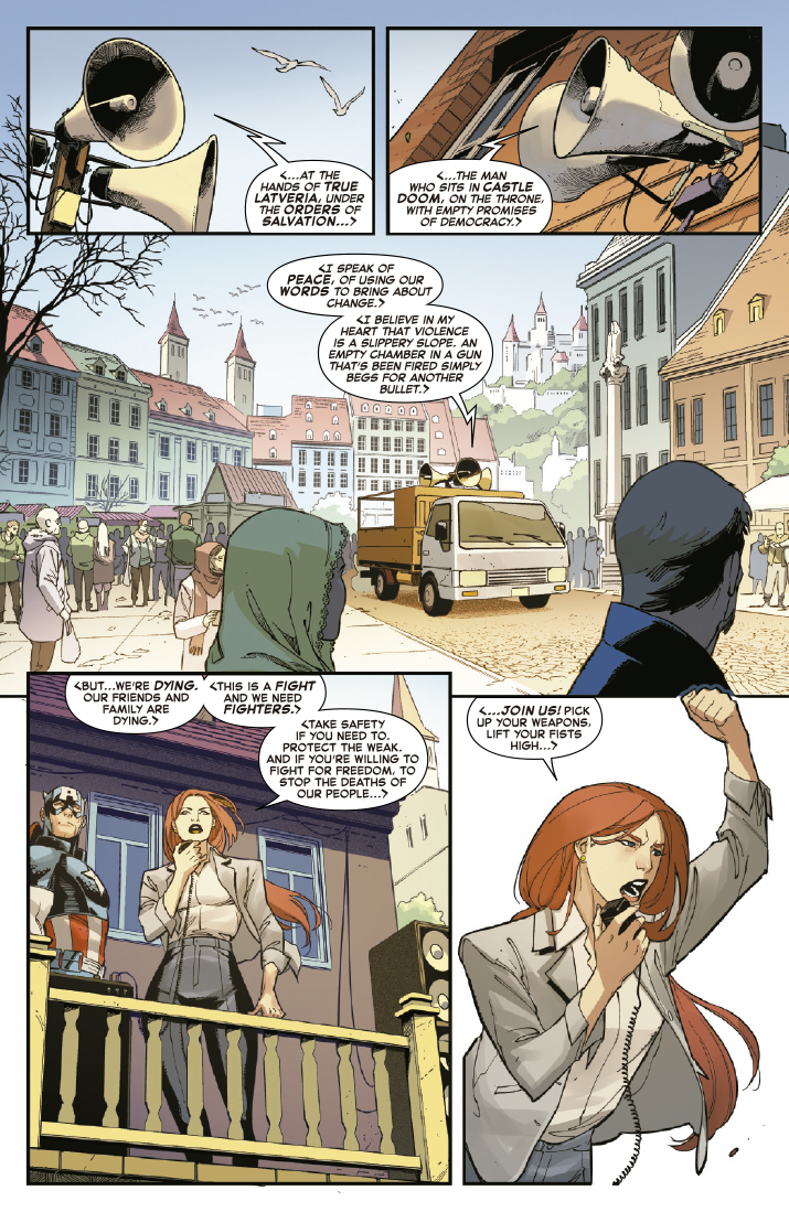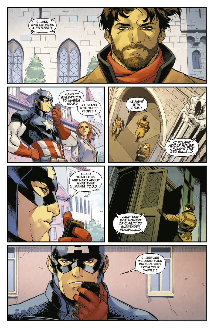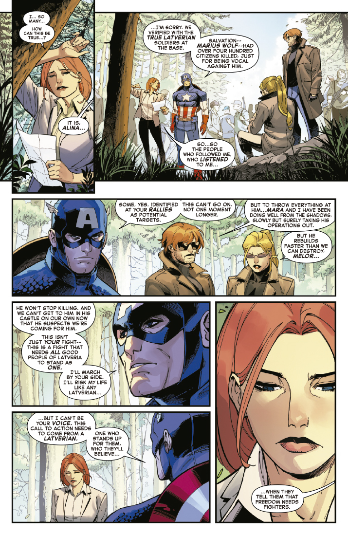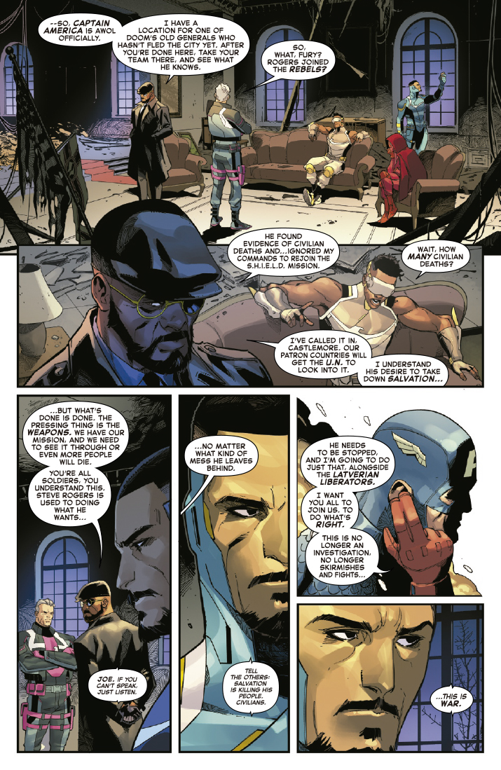 Tras descubrir hasta dónde desea ascender la insurgencia de Salvación, Verdadera Latveria, el Capitán América se escapa, colaborando con los Liberadores de Latveria para derrocar a Salvación antes de que se convierta en el próximo Doctor Muerte. Pero Salvación está preparado para el próximo ataque de Steve, y su nuevo plan tiene descorazonadoras consecuencias para el equipo…