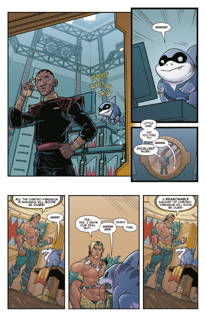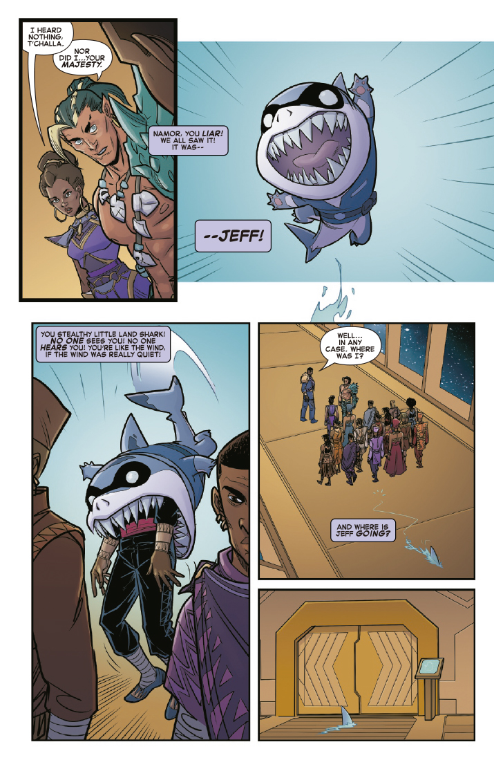 Namor y Pantera Negra tienen una historia de mala sangre entre ambos, pero cuando Namor se planta ante el Imperio Galáctico de Wakanda con fines malvados, no hay posibilidad de que la diplomacia triunfe ese día. El rey de Atlantis ha traído en secreto a Jeff el tiburón de tierra con la esperanza de robar el cronovirus de Wakanda. ¿Podran T’Challa y Shuri atrapar a estos escurridizos ladrones?