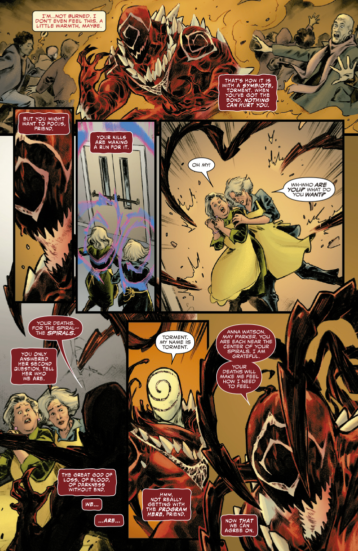 Anna Watson y May Parker han sido atrapadas en la Espiral de Muerte, y su única esperanza es ¿Flash Thomson? ¿Podrán Spiderman y Veneno salvar el día, o las viejas heridas entre MJ y Peter crearán una nueva tragedia? ¿Y dónde está Matanza en este momento? Incluso aunque lo averigües, no te lo vas a creer.