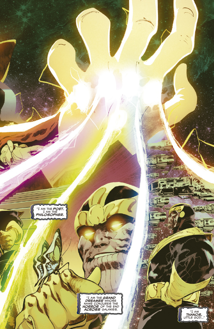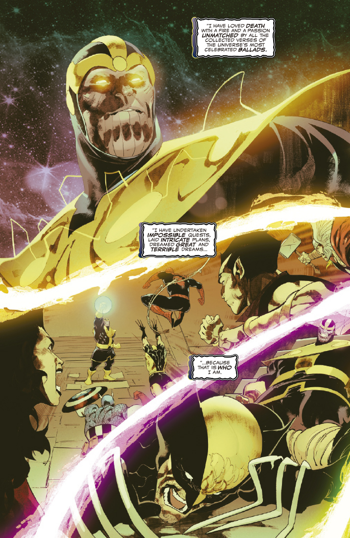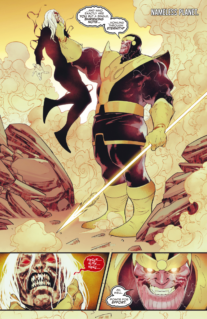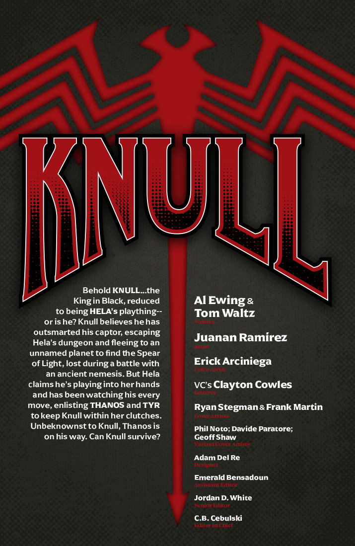 Knull ha encontrado finalmente el tesoro que buscaba, la lanza de Todas las Luces, pero hay un problema del tamaño de un titán que se interpone en su camino: Thanos tiene la lanza, y no está dispuesto a entregarla sin pelear. Mientras tanto, Hela de Asgard ha reclamado el título de Reina de Negro y ha comenzado su oscura conquista del cosmos. Asiste a un duelo titánico por la luz mientras la oscuridad se extiende por la galaxia.
