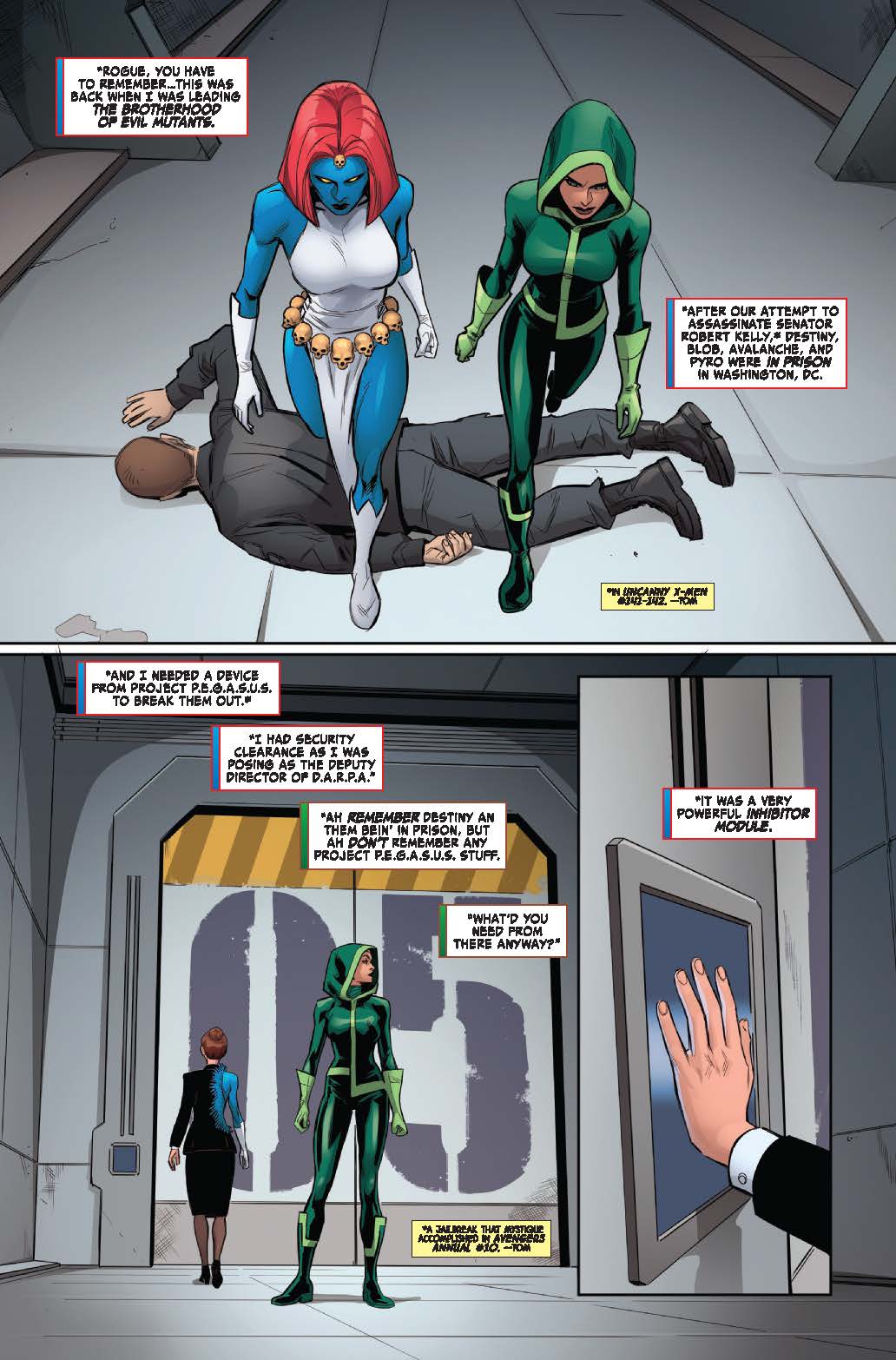En lugar de contar toda la verdad, Mística utiliza a Destino y le da a Pícara un vago resumen de lo que sucedió aquella noche en el Proyecto Pegaso, hace muchos años.