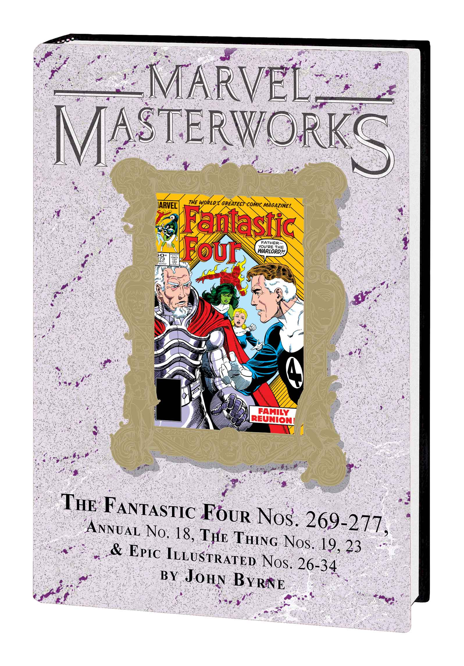 It begins with the FF, the Inhumans, a wedding, and a war between the Kree and Skrulls on the Moon! Then, the FF and Wyatt Wingfoot face a galactic menace who has landed in remote Oklahoma with a message: “I claim this planet!” The two-part tangle with Terminus is one for the ages! Meanwhile, Reed shares a tale of alien invasion by the giant green monster Gormuu before setting off on a time-traveling journey that will bring him up close with cowboys and aliens — and his time-tramping father! And as the relationship between Wyatt and She-Hulk grows more intimate, the demonic Mephisto rears his awful head — and the Thing returns from Battleworld! Plus: John Byrne’s unfinished cosmic masterpiece “The Last Galactus Story!” Collecting FANTASTIC FOUR (1961) #269-277 and ANNUAL #18, THING (1983) #19 and #23, and material from EPIC ILLUSTRATED #26-34.