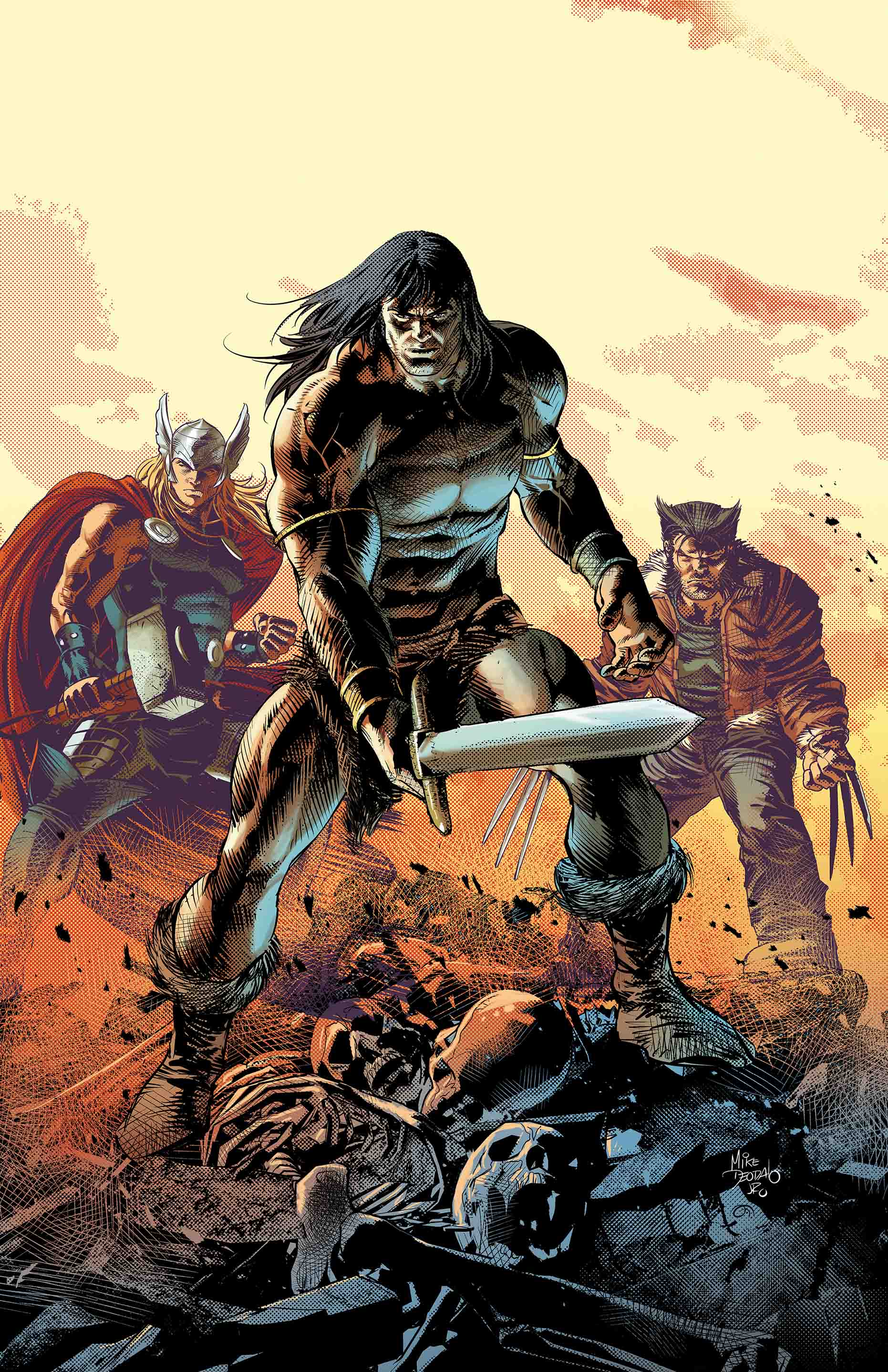 The most savage, most unkillable team of characters in the Marvel Universe is assembled! Wolverine! Venom! Elektra! Punisher! And in their midst – Conan the Barbarian! Conan has returned to the Marvel Universe and his new adventures begin here. What is the City of Sickles? Who is the Marrow God? How is the Hand involved? The roughest and most dangerous characters rumble through this new title starting with…Conan vs. Wolverine? ’Nuff said.