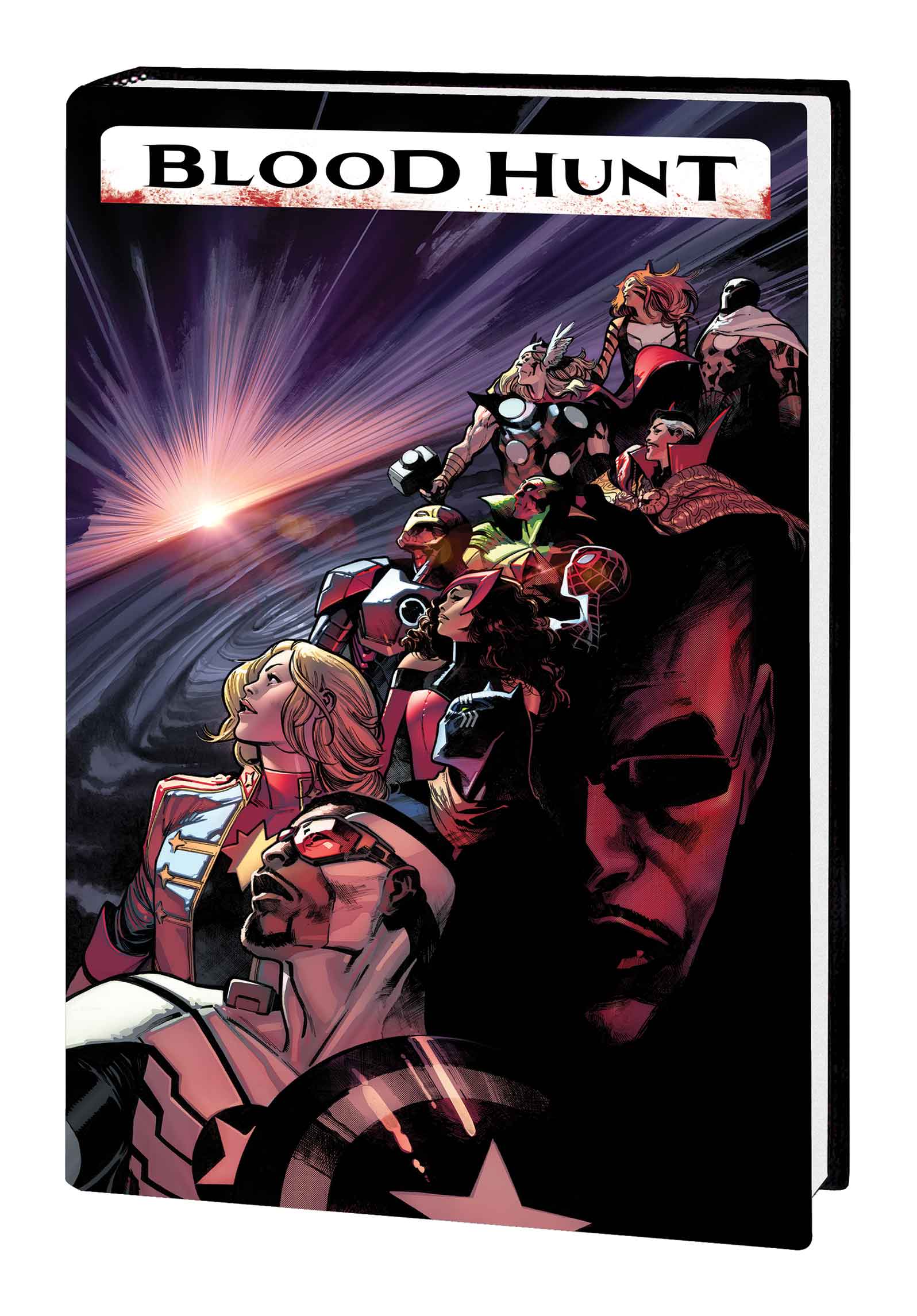 The skies have gone dark, the sun hiding its face from the carnage to come. The children of the night, the vampires, have risen from the dark and hidden places of the world as one to drown the world in blood. Earth’s final night has fallen – can its greatest heroes stem the tide? The broken Avengers join the fighters of Moon Knight’s Midnight Mission and unlikely allies Bloodline and Dracula in seeking out the one man who can do something about this: Doctor Strange. But in the wake of these apocalyptic events, what is left of Earth’s Sorcerer Supreme? And even if the world can be saved, how will it be changed? Featuring Spider-Men, Wolverines, the Hulk, the X-Men, the Fantastic Four, Venom and more of your favorite heroes – and monsters – nobody will be safe from the Blood Hunt! Collecting BLOOD HUNT (2024) #1-5, AMAZING SPIDER-MAN (2022) #49, AMAZING SPIDER-MAN: BLOOD HUNT (2024) #1-3, MILES MORALES: SPIDER-MAN (2022) #21-22, AVENGERS (2023) #14-16, BLACK PANTHER: BLOOD HUNT (2024) #1-3, STRANGE ACADEMY: BLOOD HUNT (2024) #1-3, HULK: BLOOD HUNT (2024) #1, BLOOD HUNTERS (2024) #1-4, DOCTOR STRANGE (2023) #15-17, DRACULA: BLOOD HUNT (2024) #1-3, UNION JACK THE RIPPER: BLOOD HUNT (2024) #1-3, MIDNIGHT SONS: BLOOD HUNT (2024) #1-3, WEREWOLF BY NIGHT: BLOOD HUNT (2024) #1, X-MEN: BLOOD HUNT – JUBILEE (2024) #1, X-MEN: BLOOD HUNT – MAGIK (2024) #1, X-MEN: BLOOD HUNT – PSYLOCKE (2024) #1, X-MEN: BLOOD HUNT – LAURA KINNEY THE WOLVERINE (2024) #1, WOLVERINE: BLOOD HUNT (2024) #1-4, FANTASTIC FOUR (2022) #21-22, VENGEANCE OF THE MOON KNIGHT (2023) #5-7, VENOM (2021) #33-34 and material from FREE COMIC BOOK DAY 2024: BLOOD HUNT/X-MEN.