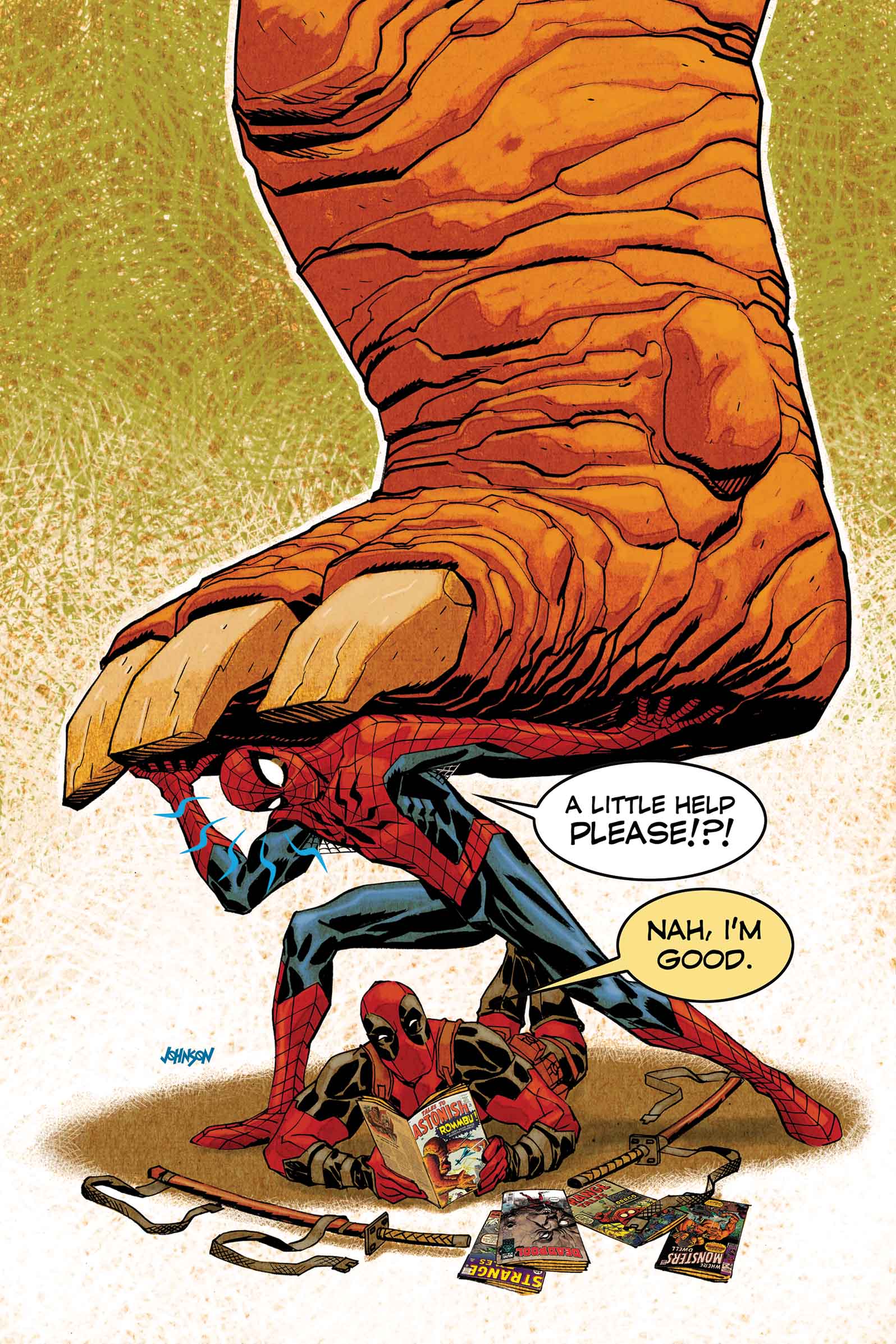 • Spider-Man and Deadpool find themselves face-to-face(-to-face?) with one of the dozens of monsters smashing and stomping their way through the Marvel Universe!