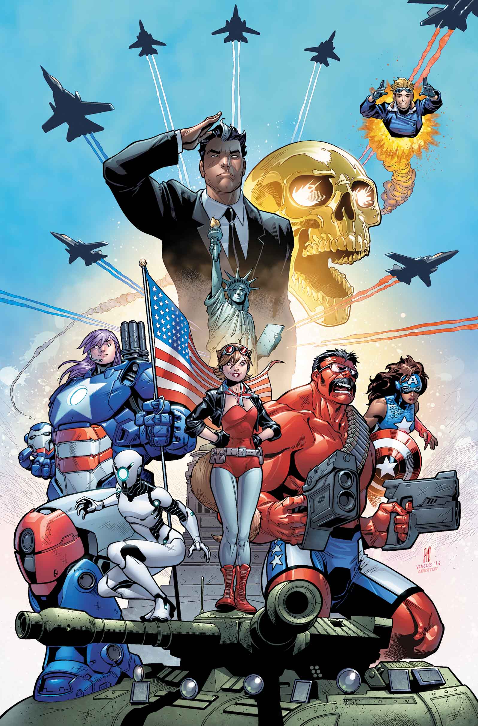 wildest, weirdest threats of all! The most patriotic super-group ever is here to save the day. And they’ll do it all looking tried & true