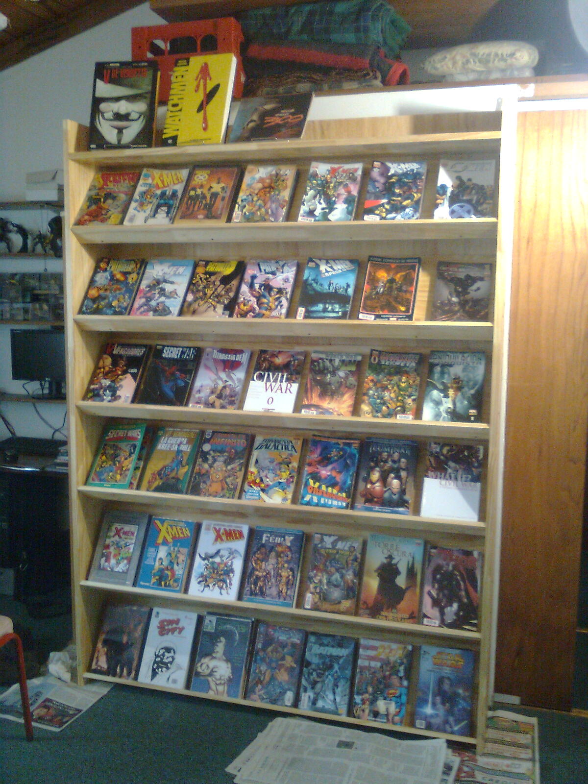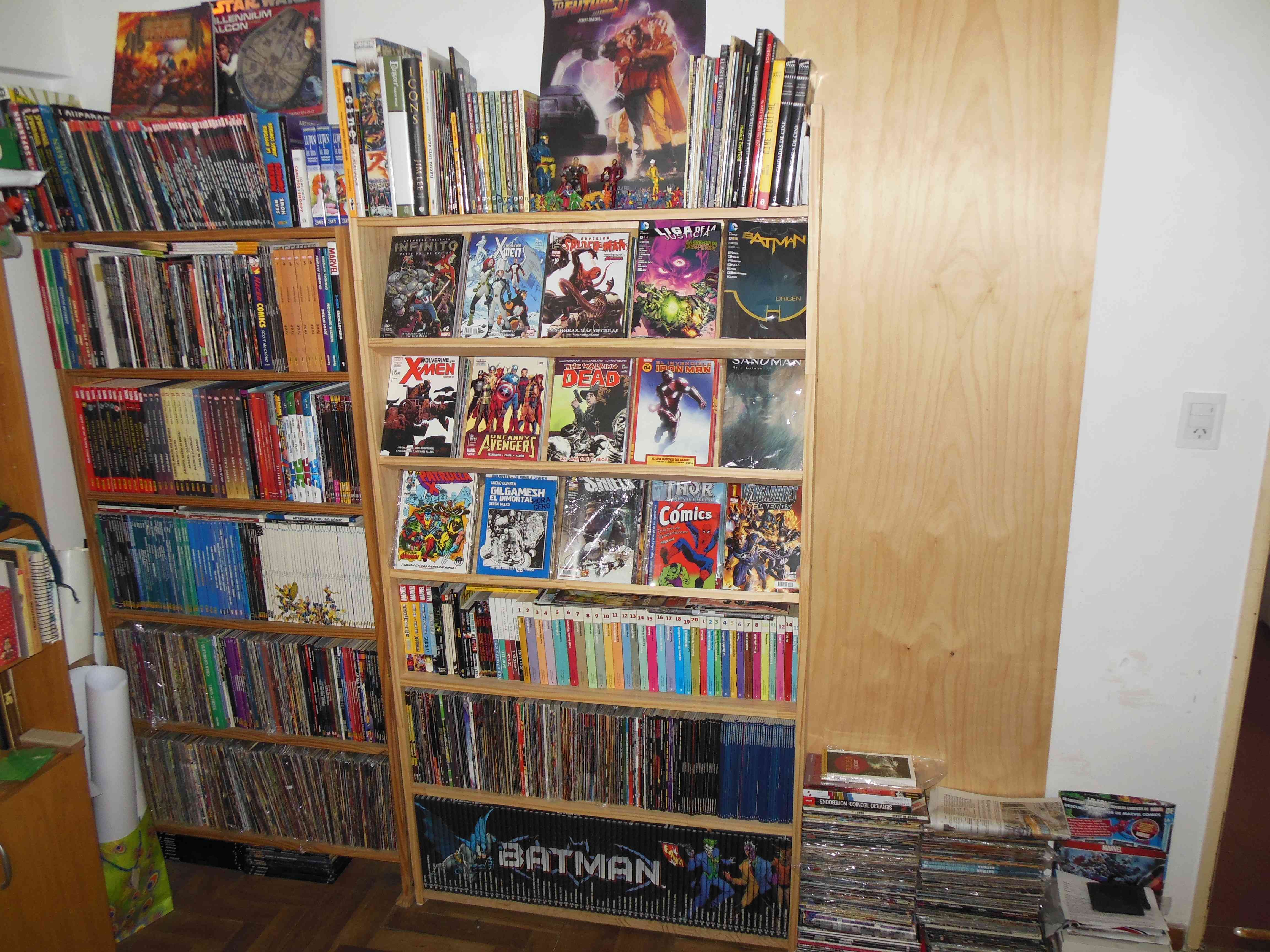 PD: Adjunto otra foto de la estantería que tengo en lo de mis viejos y no le pude sacar foto ahora. Está en menor calidad, pero la hice diseñé y armé yo (mandé a cortar la madera). La otra estantería que tiene parte inclinada tmb.