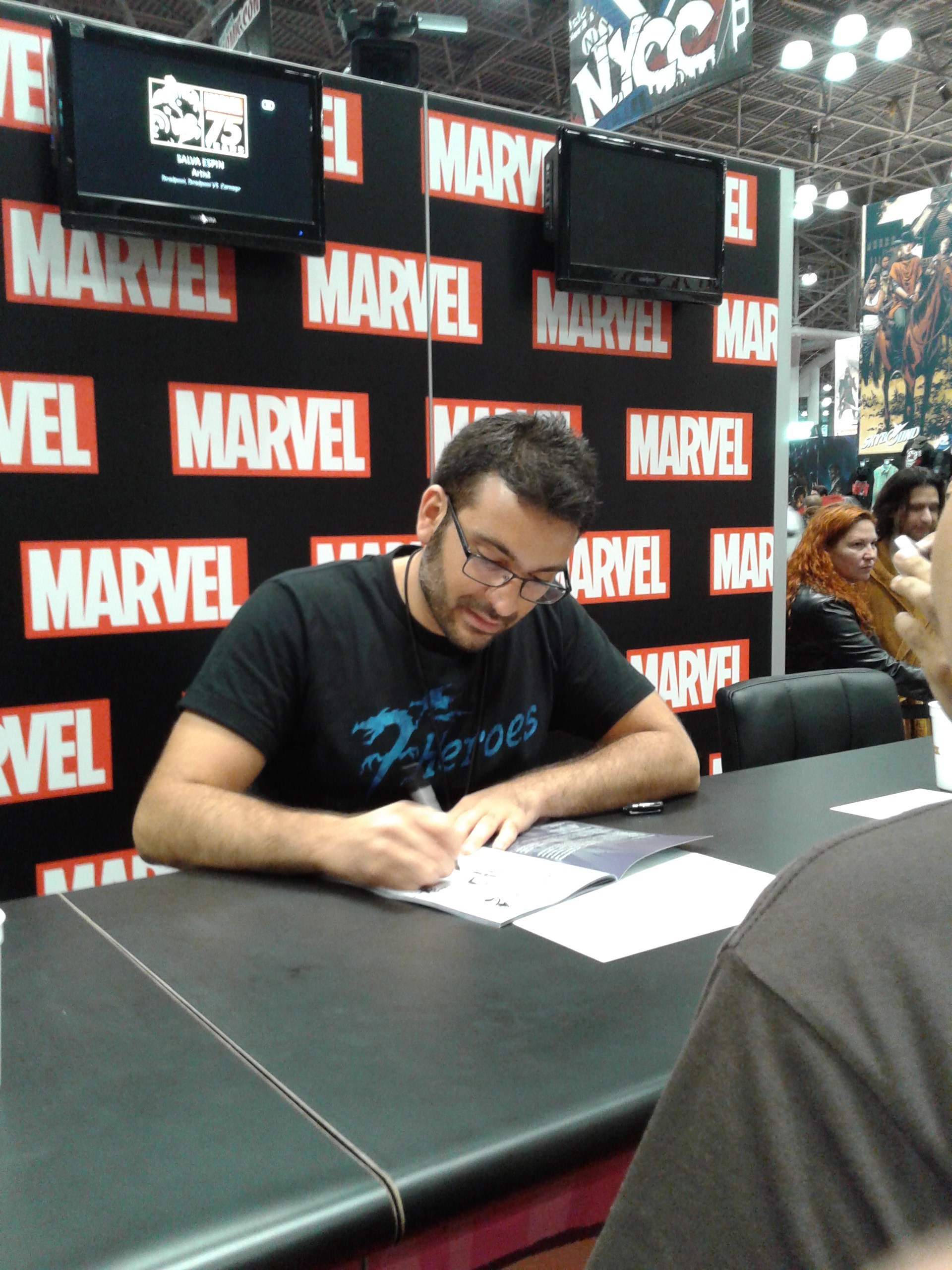 Salvador Espín, dibujante murciano en Marvel Comics, estuvo este pasado fin de semana en la New York Comic Con presentado sus nuevos proyectos con el personaje Deadpool, el más reciente Deadpool Bi-Annual, con guionistas comos los actores y cómicos amiericanos Paul Scheer (La Liga Fantástica) y Nick Giovanetti. El viernes 10, Salva participó en la multitudinaria sesión de firmas y dedicatorias de celebración por el 75 aniversario de Marvel. El sábado 11 realizó una sesión de firmas en el stand que Marvel tiene en la exitosa convención.