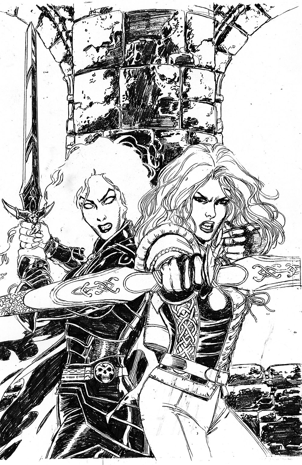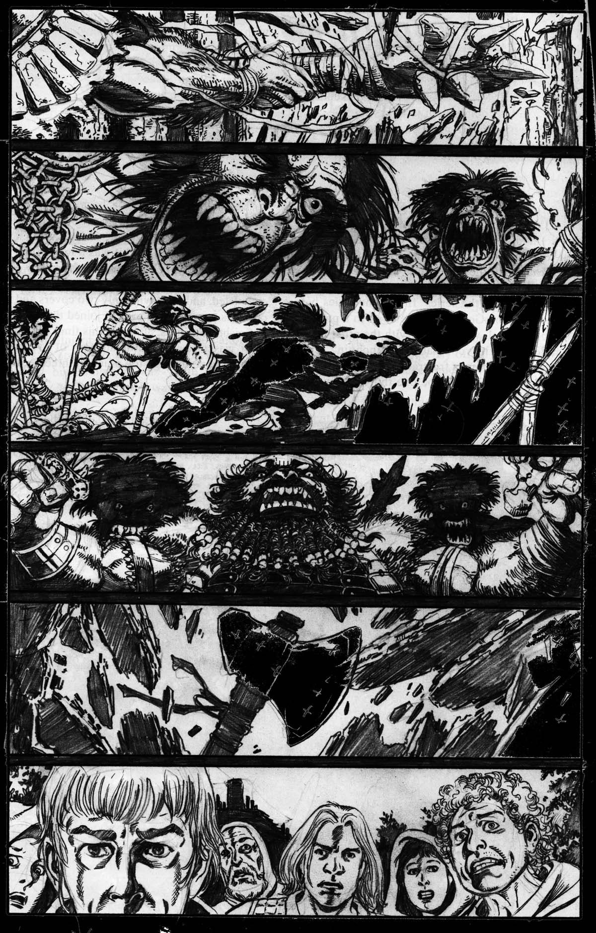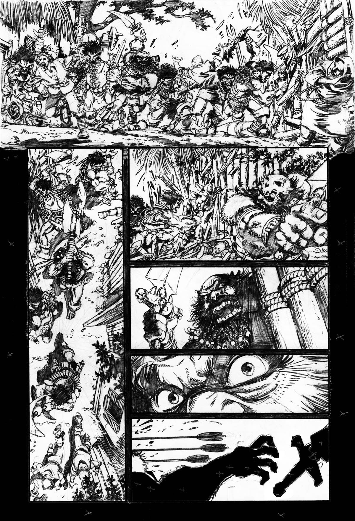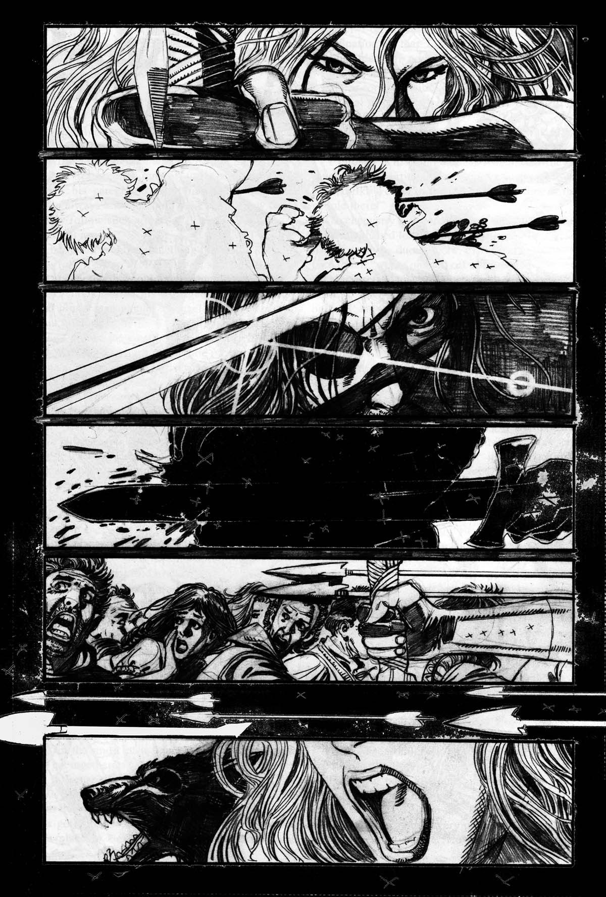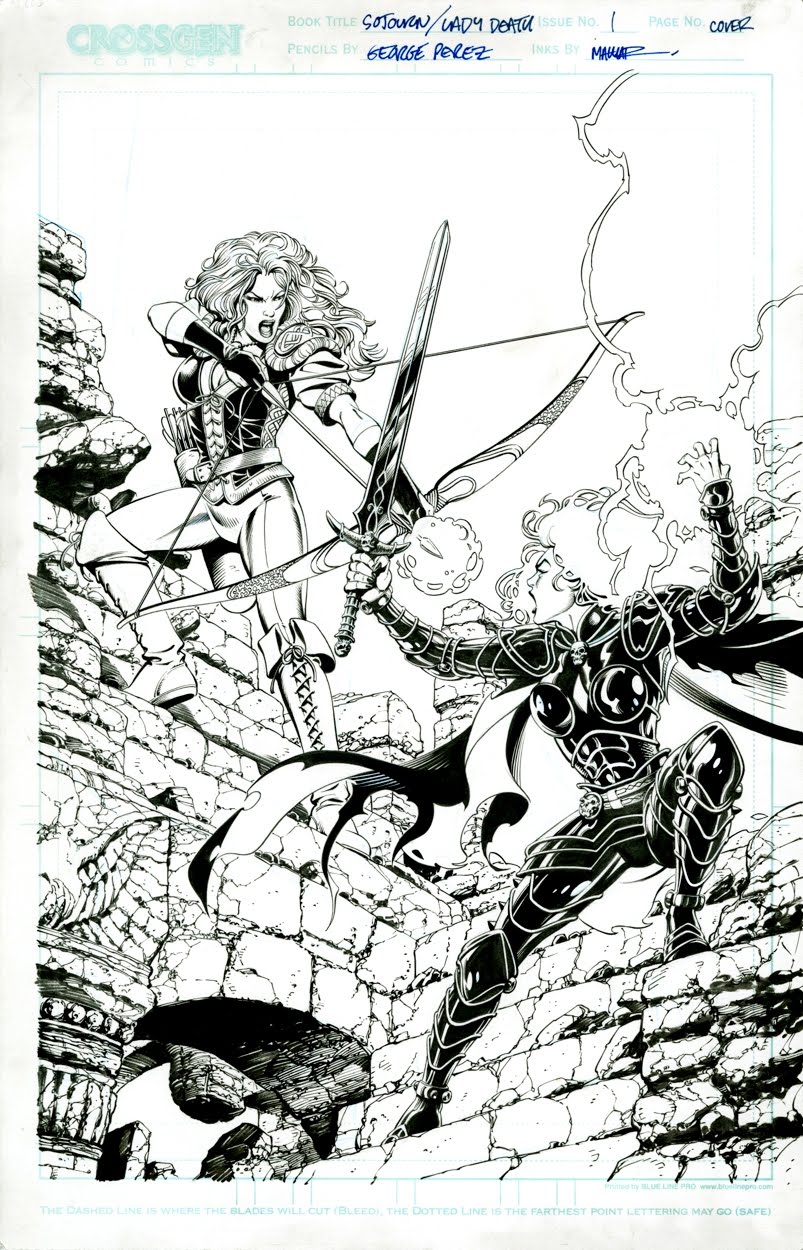 Otro proyecto de Pérez que quedó inconcluso habría presentado un crossover de Sojourn y Lady Death, aprovechando que la versión medieval de esta última había pasado a engrosar la parrilla de títulos de CrossGen Comics. El hundimiento de la editorial en 2004 frustró esta serie limitada de dos números que iban a escribir conjuntamente Chuck Dixon y Brian Pulido. Al bueno de George únicamente le fue posible dibujar las dos portadas y cinco páginas interiores. Llamo vuestra atención sobre lo curradisimas que están las páginas a lápiz. Salta a la vista que Pérez se tomó el encargo con la máxima seriedad… ¡La splash page de Arwyn y Gareth es verdaderamente espectacular!