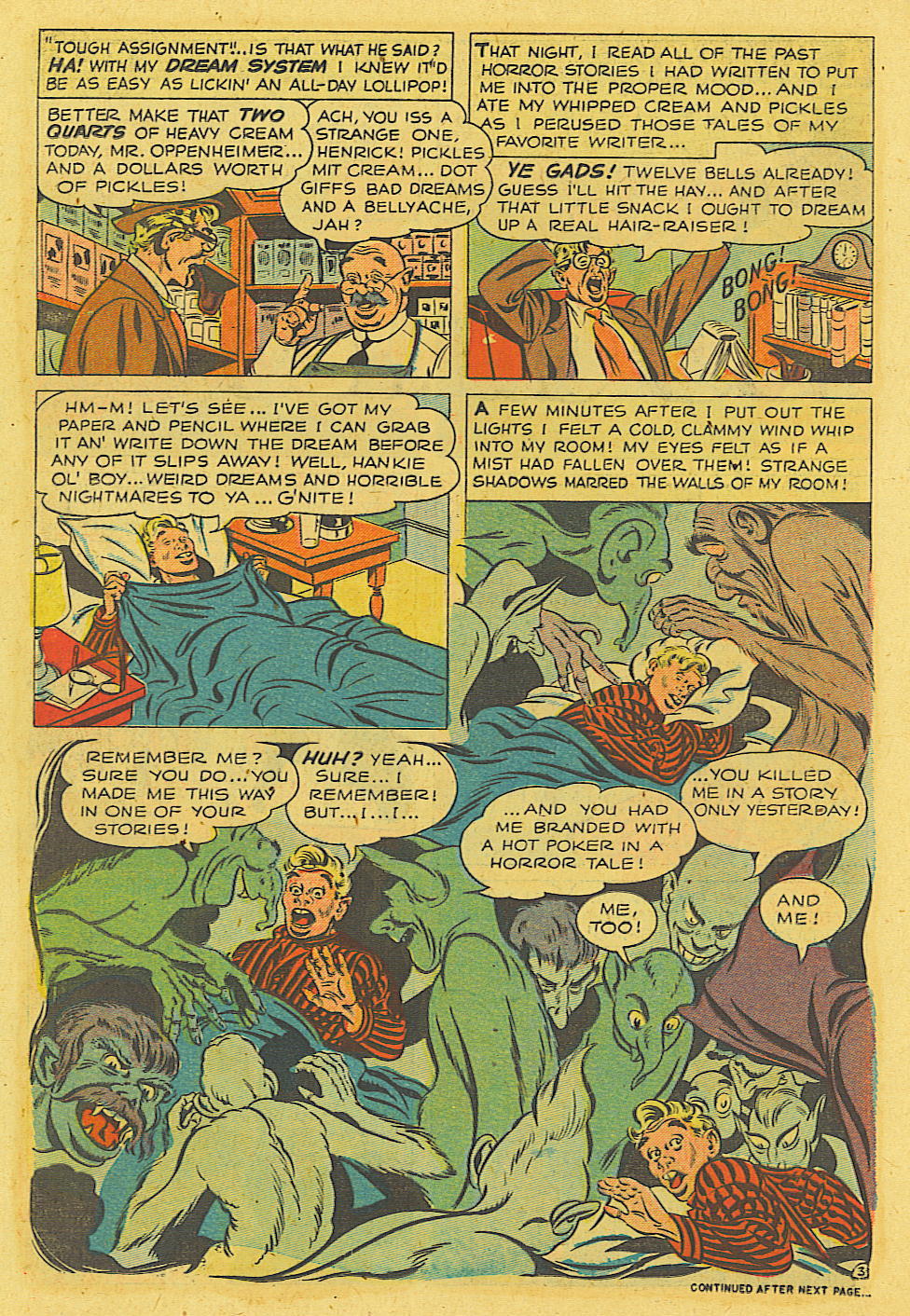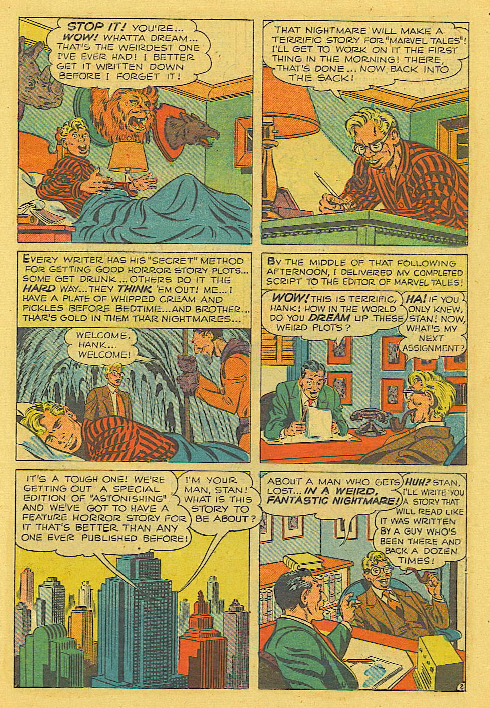 Nuestro carrusel cronológico de hoy vamos a concluirlo reproduciendo íntegramente la historia perteneciente a la antología Astonishing # 4 USA que supondría el estreno «serio» de Stan Lee como personaje en un cómic Marvel. “La pesadilla” contaba con textos de Hank Chapman y dibujos de Wayne Boring, quien no tardaría en convertirse en uno de los grandes artistas clásicos de Superman (supongo que hay una cierta ironía en todo ello, pero no nos detendremos a comentarla). La narración planteaba el típico argumento de suspense donde un guionista recurre a sus pesadillas como fuente de inspiración y termina siendo asaltado por ellas. En la segunda página se muestra al propio Chapman departiendo en el despacho de Stan Lee, a quien se identifica como el editor de Marvel Tales.