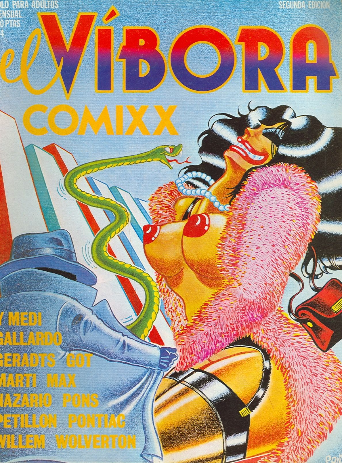 A los que podáis agenciaros una copia del Especial USA de El Víbora, os recomiendo vivamente que no dejéis pasar la oportunidad. Según mi criterio, es el mejor especial que sacaron, y no sólo por la contribución de Wolverton. Entre las luminarias del comix underground representadas en la revista figuran Robert Crumb, Gilbert Shelton, Art Spiegelman, Harvey Kurtzman, “Spain” Rodríguez, Bill Griffith, Kim Deitch, S. Clay Wilson y Rand Holmes. La verdad es que este último era canadiense, pero decidieron incluirlo igual. Eso sí, debo advertir que algunos contenidos eran bastante salvajes… ¡susceptibles de herir sensibilidades delicadas!