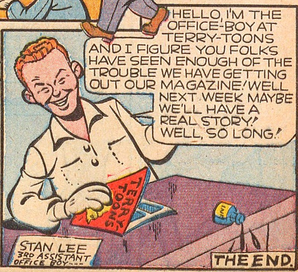 Stan figuraba como editor consultivo en los créditos de la revista, a pesar de que hacía ya tiempo que se había alistado en el ejército. ¡Más sorprendente aún es que en la viñeta se presentara a sí mismo como el “chico de los recados”!