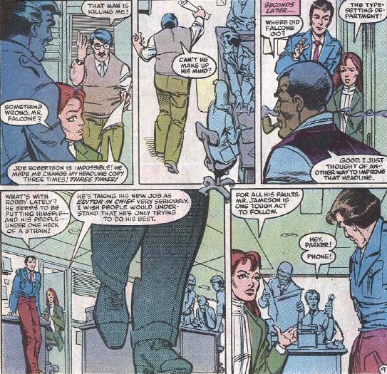 Otro misterio sobre el que podemos arrojar luz es el que hace referencia a «Falcone«, el sosias de Tom DeFalco que se paseaba por la redacción del Daily Bugle en las páginas de Amazing Spider Man # 254 USA. Básicamente, se trató de una broma que Leonardi dejó caer por su cuenta porque pensó que resultaría divertido. El cameo no era algo que estuviera especificado en el argumento: DeFalco se encontró con la sorpresa al ver la página dibujada. La participación del guionista en la coña marinera consistiría en añadir una línea de diálogo donde su doble comiquero se lamentaba amargamente de que le obligaran a reescribir los titulares tres veces. ¡Y Rick piensa, igual que yo, que aquel comentario escondía una crítica velada al estilo editorial que Jim Shooter impuso mientras se mantuvo al frente de Marvel!