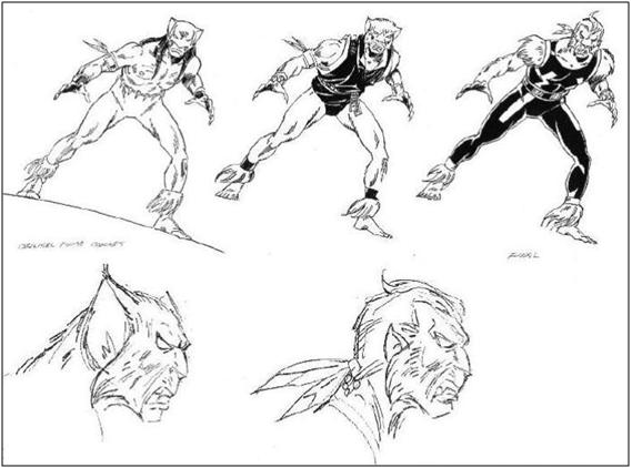 Del Puma vamos a hablar muy poquito, porque estimo mucho más interesante mostraros los bocetos que utilizó Ron Frenz para terminar de definir el look del personaje. Los apuntes preliminares de DeFalco describían a Thomas Fireheart como un nativo americano que se manejaba como un hombre frío e implacable en su identidad civil, desatándose sus instintos animales más salvajes al convertirse en el Puma. El guionista comparaba su transformación con la de un hombre lobo.