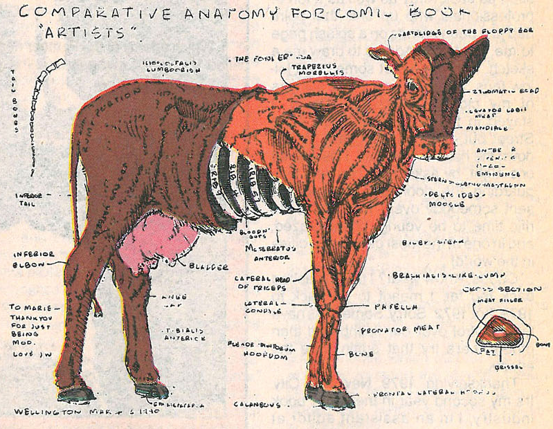 Las vacas de Marie Javins reflejan las diferentes sensibilidades creativas de los creadores que le ayudaron a decorar su muro. ¡Mike Mignola, Ted McKeever, Moebius y Jim Lee dan testimonio de ello! Tiene gracia que Mignola denominara Hellcow a su ejemplar bovino… ¡sobre todo porque el dibujo se anticipó en casi tres años al debut de Hellboy!