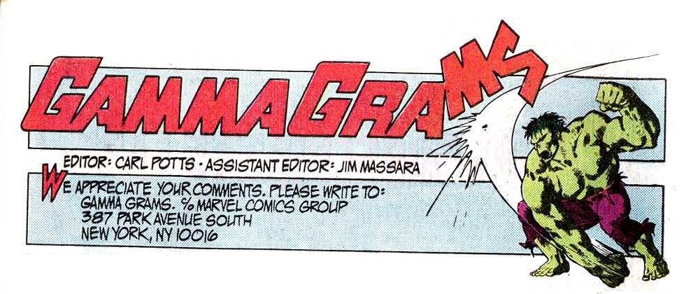 Cerramos capítulo reseñando la nueva etapa iniciada en Incredible Hulk # 301 USA, después de que el goliat esmeralda quedara exiliado en un cruce dimensional. Dicha renovación encontraba reflejo asimismo en la sección de correo, donde el habitual “Green Skin’s Grab-Bag” cedió el testigo al mucho más efectivo «Gamma Grams«. El diseño del logo y el dibujo que lo acompaña corrieron a cargo de Kevin Nowlan.