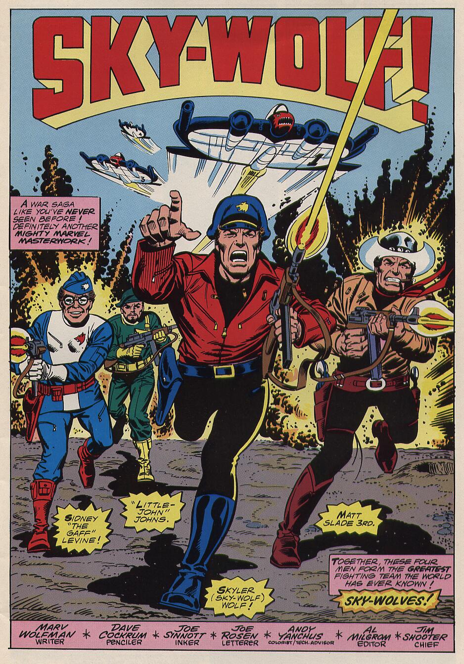 También a la venta por estas mismas fechas, Marvel Fanfare # 16 USA estrena el nuevo serial Sky-Wolf, con guión de Marv Wolfman, dibujos de Dave Cockrum y tintas de Joe Sinnott. Según explicaría el editor Al Milgrom, este proyecto había empezado a gestarse ocho años atrás, pero diversas circunstancias habian dificultado que pudiera completarse. El tebeo venía a ser un remedo marveliano de Blackhawk, el clásico comando de aviadores de la Segunda Guerra Mundial que comenzó sus aventuras en las revistas de Quality Comics antes de que los personajes fueran adquiridos por DC Comics en 1956. Tanto Wolfman como Cockrum eran fans incondicionales de los Halcones Negros y quisieron rendirles un tributo. Sin embargo, la reacción de los lectores no resultó en absoluto positiva. Con cierta ironía, el propio Wolfman reconoce que en toda su carrera jamás se ha topado con un aficionado que le haya dado a firmar un ejemplar de Sky-Wolf… ¡Mayor reconocimiento de un fracaso no cabe!