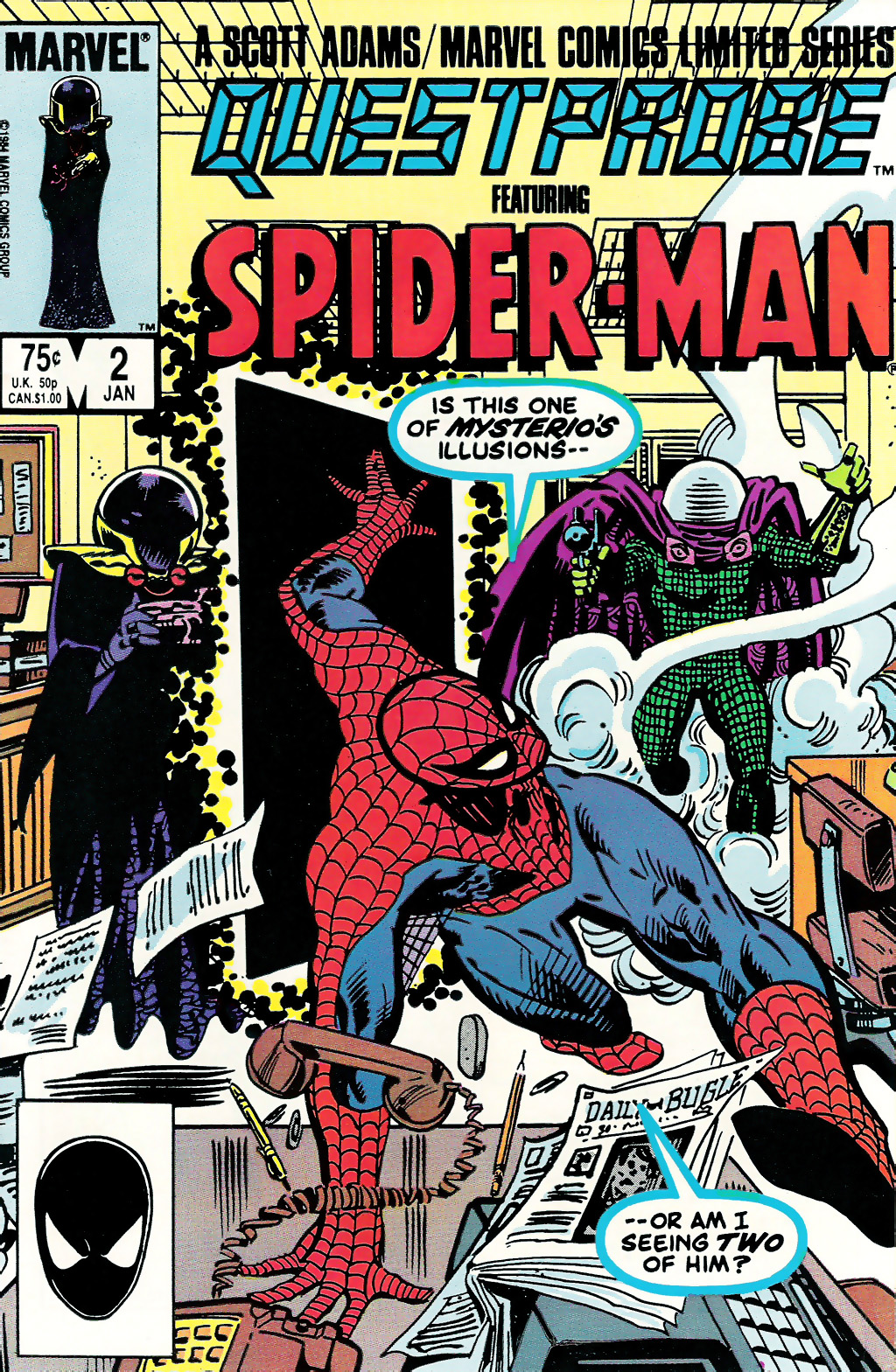 9 de Octubre. Questprobe # 2 USA hace entrar en el juego a Spiderman. La trama de esta aventura escrita y dibujada por Al Milgrom arranca cuando Mysterio escapa de prisión y acaba atrincherado en el edificio del Daily Bugle, retando al Hombre Araña a enfrentarse con él. Al irrumpir el Examinador Jefe en las oficinas, el trepamuros cree que se trata de Mysterio con un disfraz diferente. La confusión venía propiciada por las similitudes entre los cascos de ambos personajes. No deja de tener su guasa que en los títulos de crédito figurara Jim Shooter como «Examinador Jefe«… ¡Desde luego, es un mote que le venía como anillo al dedo!