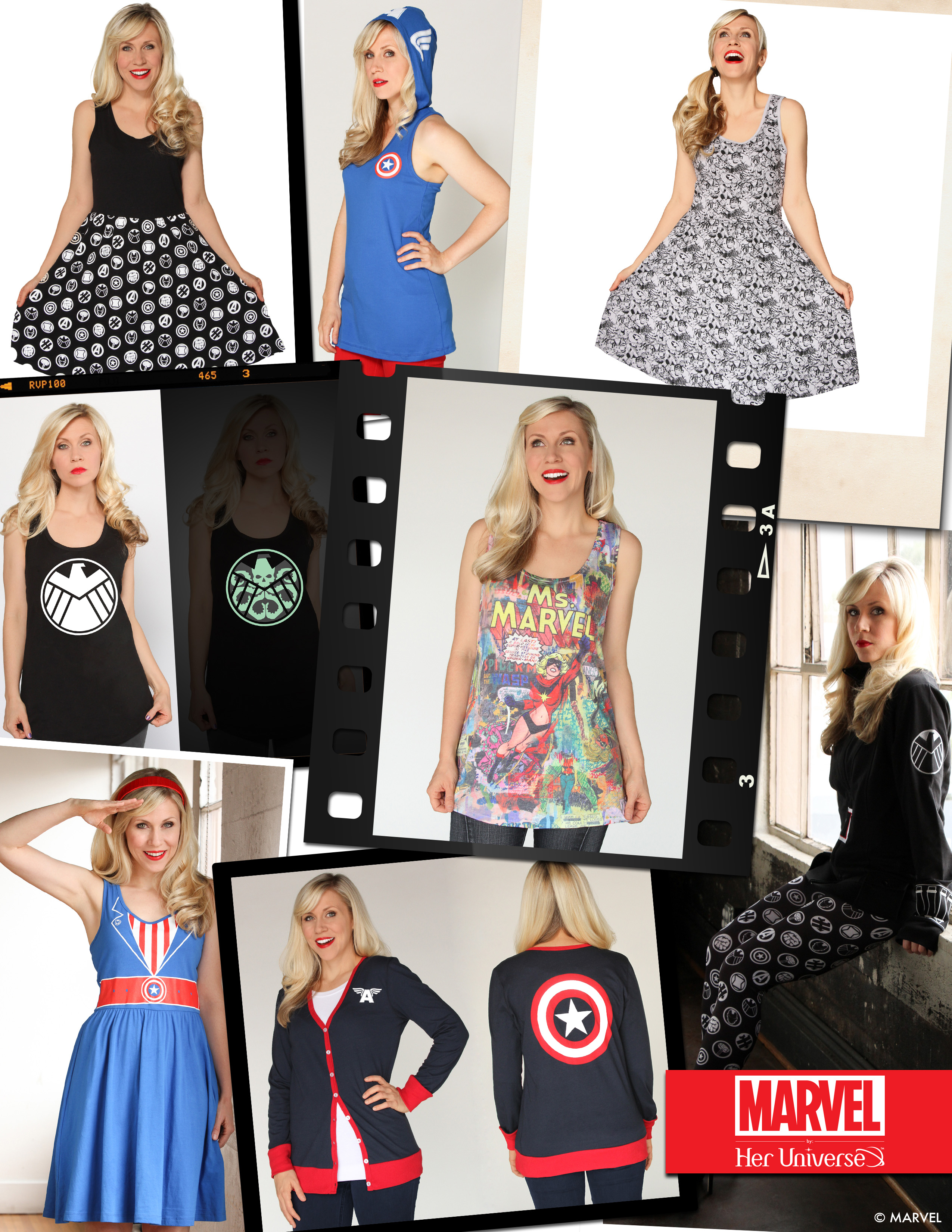 Finalmente, los héroes de Marvel han conseguido abrirse camino hasta el mucho más relevane económicamente mercado de la moda femenina. El verano pasado se presentó la línea «definitiva» de ropa y complementos para chicas a cargo de la marca Her Universe, que en colaboración con Marvel (y Disney Consumer Products, claro), puso a la venta la primera tanda de prendas para «la cada vez más creciente base de aficionadas a los personajes de Marvel», según se decía en el comunicado oficial. Lo que se denominó «geek couture» en ese momento consistía en una selección de tops, camisetas con y sin mangas, pantalones, vestidos, jerseys, capuchas, faldas, mallas y demás prendas de vestir femeninas que estaban iluminadas con los colores y emblemas de los superhéroes de Marvel.